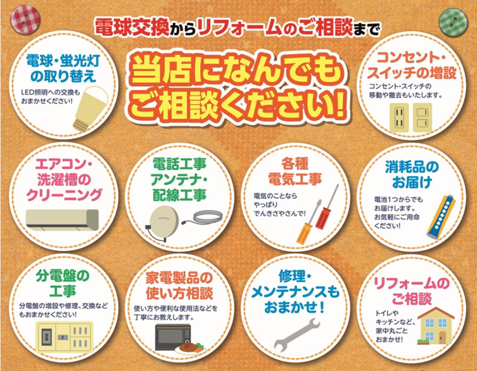 電球交換からリフォームのご相談まで、電気のこと・お家のことなら当店に当店になんでもご相談くださいませ! |